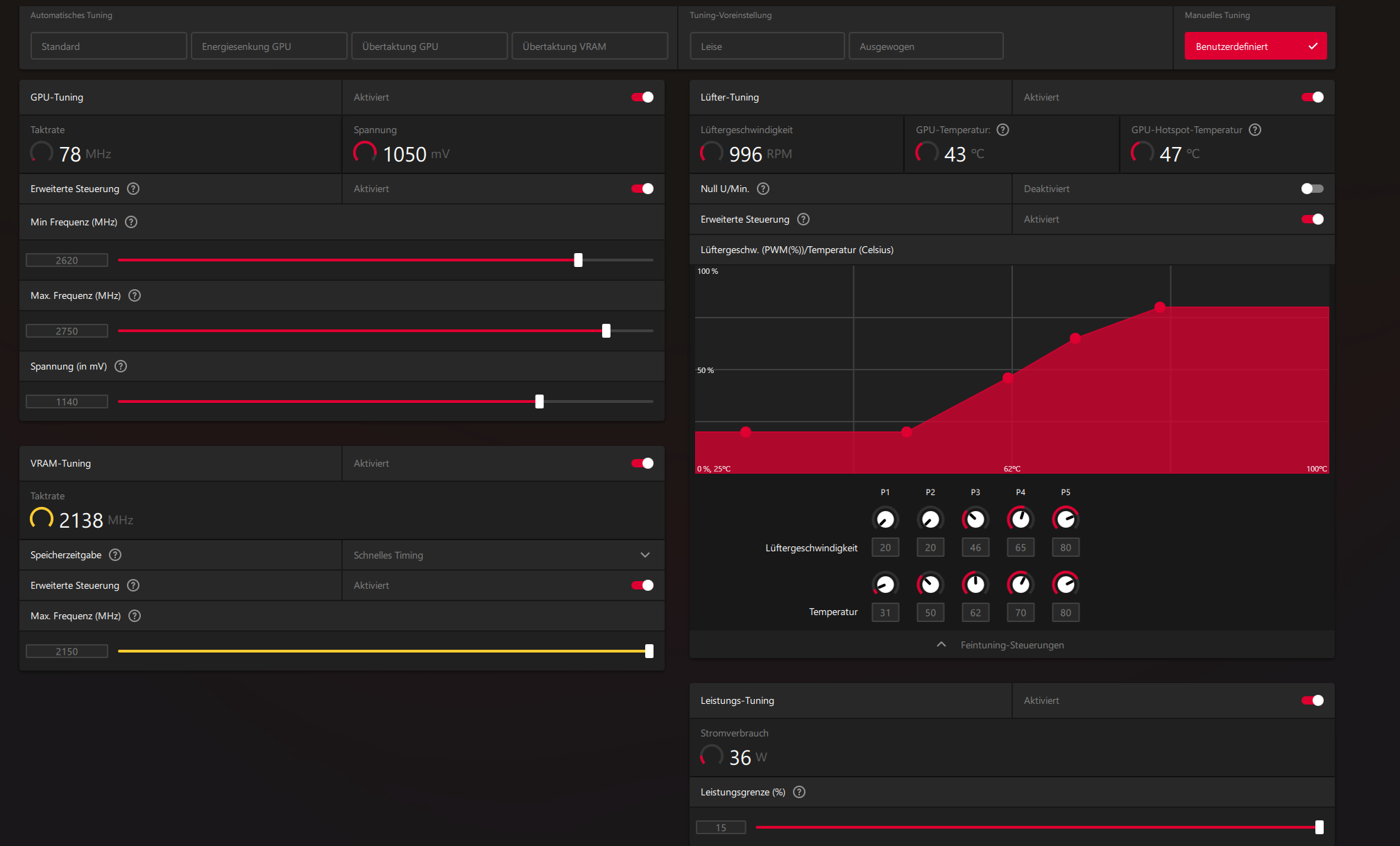 Da ich ein neues Case habe, wollte ich meine Grafikkarte mal ein bisschen übertakten. Ich wollte fragen, ob ich das gut gemacht habe, oder ob noch wer Tipps für noch mehr Leistung bei niedrigerer Spannung hat. Läuft stabil.