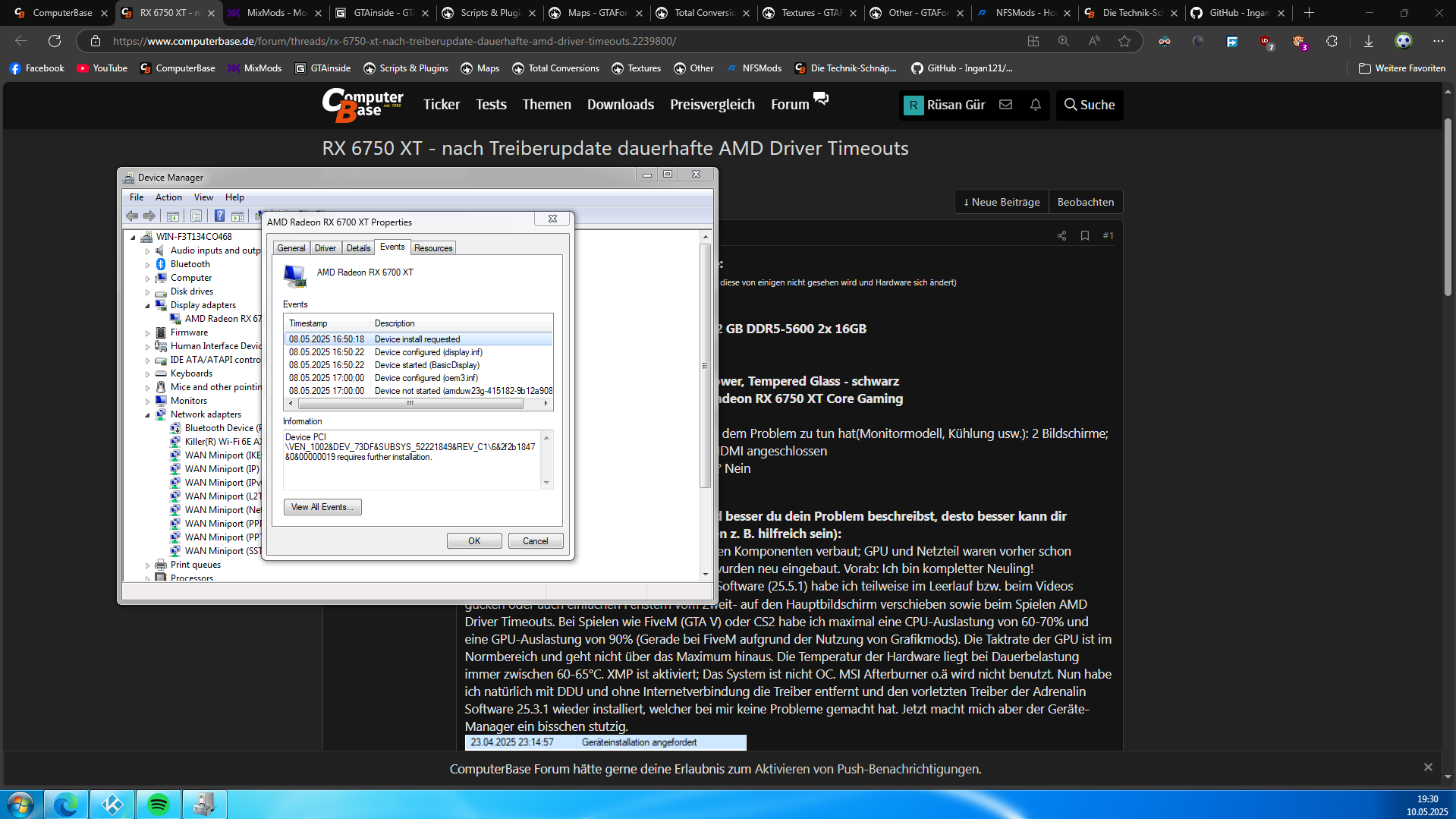 Seit dem letzten Treiberupdate der Adrenalin Software (25.5.1) habe ich teilweise im Leerlauf bzw. beim Videos gucken oder auch einfachen Fenstern vom Zweit- auf den Hauptbildschirm verschieben sowie beim Spielen AMD Driver Timeouts. Bei Spielen wie FiveM (GTA V) oder CS2 habe ich maximal eine CPU-Auslastung von 60-70% und eine GPU-Auslastung von 90% (Gerade bei FiveM aufgrund der Nutzung von Grafikmods). Die Taktrate der GPU ist im Normbereich und geht nicht über das Maximum hinaus. Die Temperatur der Hardware liegt bei Dauerbelastung immer zwischen 60-65°C. XMP ist aktiviert; Das System ist nicht OC. MSI Afterburner o.ä wird nicht benutzt. Nun habe ich natürlich mit DDU und ohne Internetverbindung die Treiber entfernt und den vorletzten Treiber der Adrenalin Software 25.3.1 wieder installiert, welcher bei mir keine Probleme gemacht hat. Jetzt macht mich aber der Geräte-Manager ein bisschen stutzig.