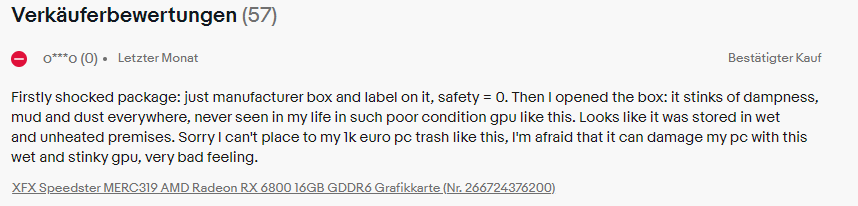 Das wäre mir in dem Fall sogar egal - gewerbliche Verkäufer, die aber durchaus "shady" unterwegs sind, können deutlich mehr Ärger machen, als ein seriöser Privatverkäufer. Mehrere hunderte Euro teure Ware würde ich dennoch nicht von privat über Ebay kaufen, ungesehen schon dreimal nicht. Da stinkt's nach Kippenqualm, da ist irgendwo mal Flüssigkeit aus ner WaKü drübergelaufen, da kleben die Katzenhaare nur so wie verrückt im Lüfter/Kühler ... all das ist dann aber schön kaschiert und man sieht/liest da von nichts im Angebot.