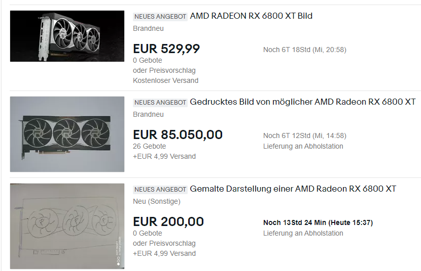 Ich hab einfach mal versucht, eine 6800XT zu bekommen, hatte bei Mindfactory sogar eine im Warenkorb, aber dann kam ich nicht weiter, weil die Server überlastet waren und dann hieß es, meine Ware aus dem Warenkorb sei bereits von anderen gekauft worden.