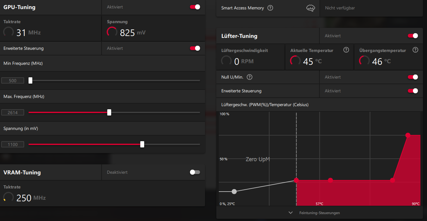 Und vielleicht mal probieren den Zero RPM Modus abzuschalten, damit die GPU gleich von Anfang an ein bisschen kühler bleibt. Ich hoffe SAM hat ein bisschen was bewirkt.