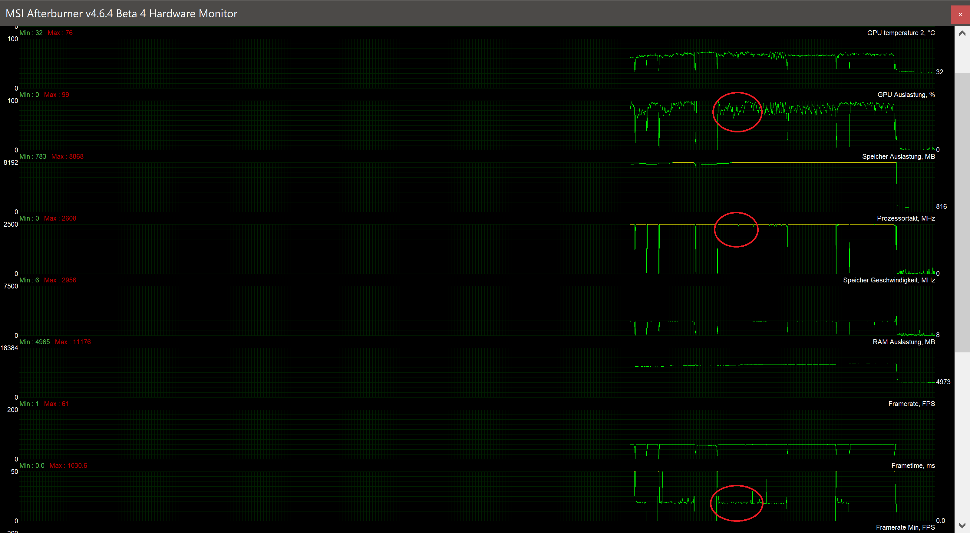 ich scheine kein Frametimeproblem zu haben. die Markierten bereiche haben keine Drops bzw Schwankungen obwohl das Spiel (in diesem Fall RDR2) alle 13 bis 15 Sekunden ruckelt.