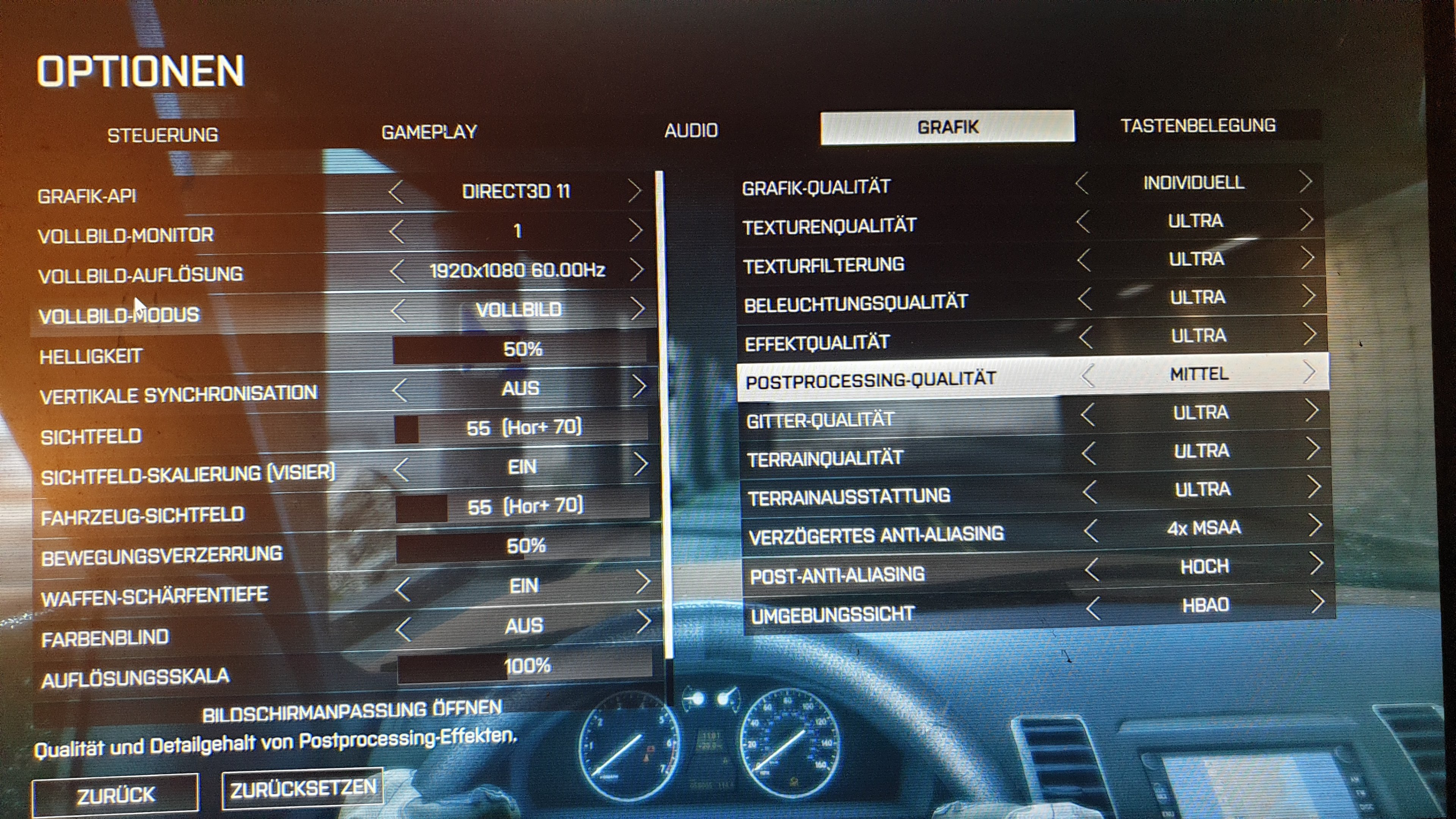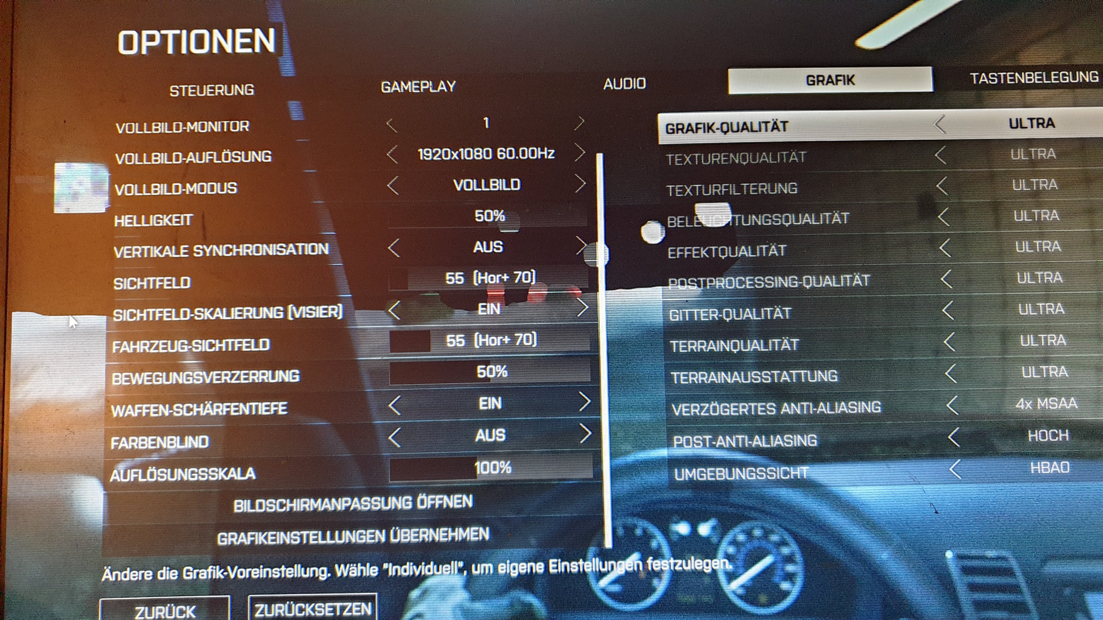 ... Ich habe anstatt auf Ultra zu zocken mal auf High runtergestellt ...Problem bleibt bestehn im pausemodus! ....erst wenn ich die Grafikeinstellung auf Mittlere im Spiel stelle dann ist der Grafikfehler nicht mehr zu sehen! Ich würde jetzt gern von euch wissen....Ist dies einfach ein Bug des Spiels da es ja gute 8J alt ist oder was kann es sein? Habe die Battlefield 4 Premium Version mit allen DLCS