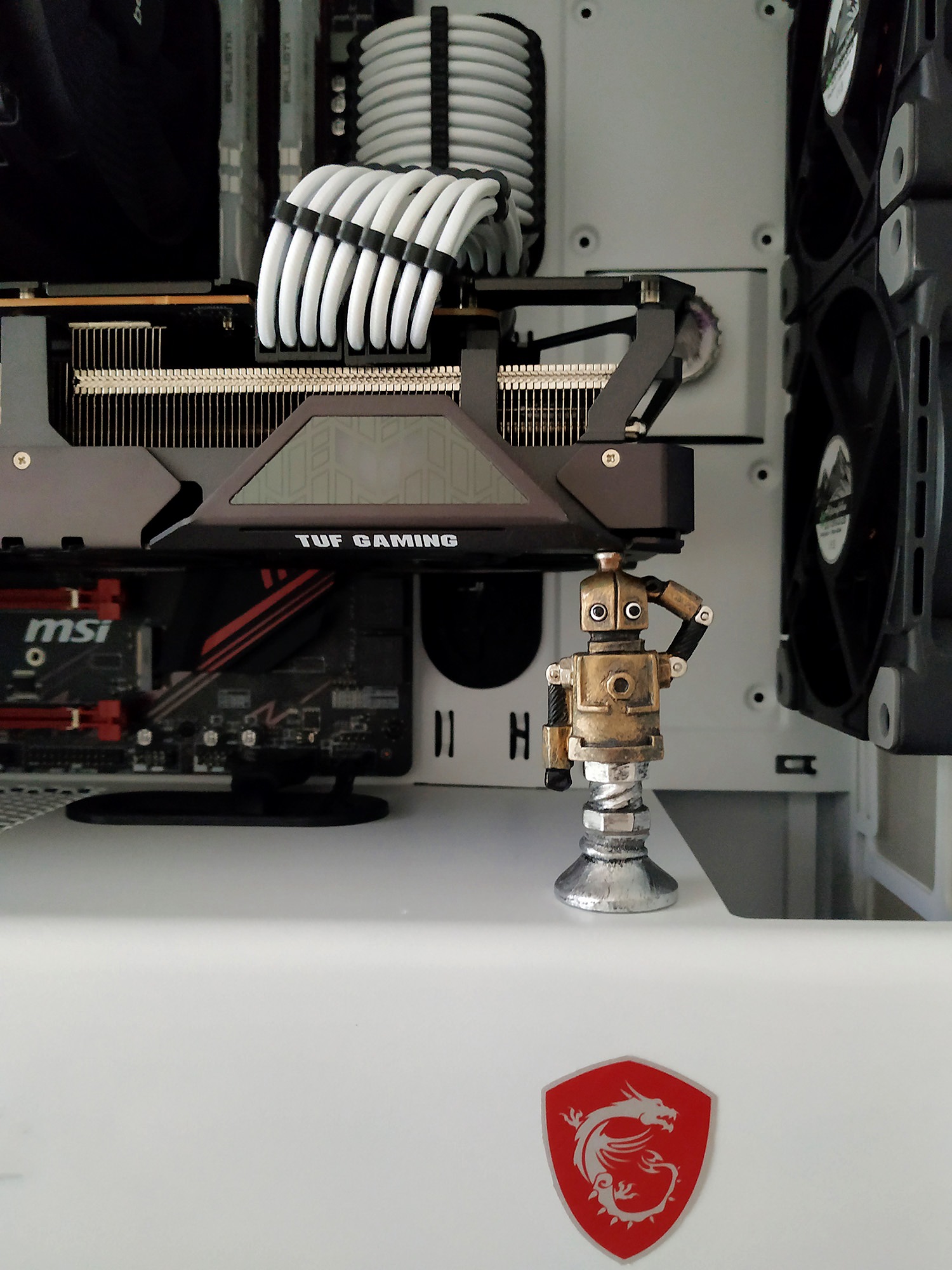 Da meine 3080ti schon hing, die 3090er hätte so elash Schnur dabei von oben abhängend,was mir nicht so gefällt, die Stütze unten hat schon Platz bei dem doppelten Boden (Netzteilabdeckung) im Gehäuse.