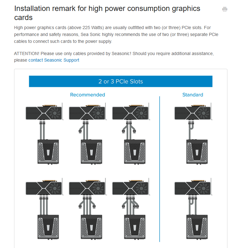 Ich kenne die Seasonic Anleitung. Habe ja auch ein Seasonic Netzteil. Aber wie schon gesagt. Aus technischer Sicht völliger Blödsinn. Seasonic zum Bleistift verwendet AWG18 Kabel. Die sind auf 14 oder 18 Ampere (bin mir da jetzt nicht so sicher) ausgelegt. Das bei 90°C. Vom Netzteil gehen 3x 12V weg in jedem 8 Pin GPU Kabel.