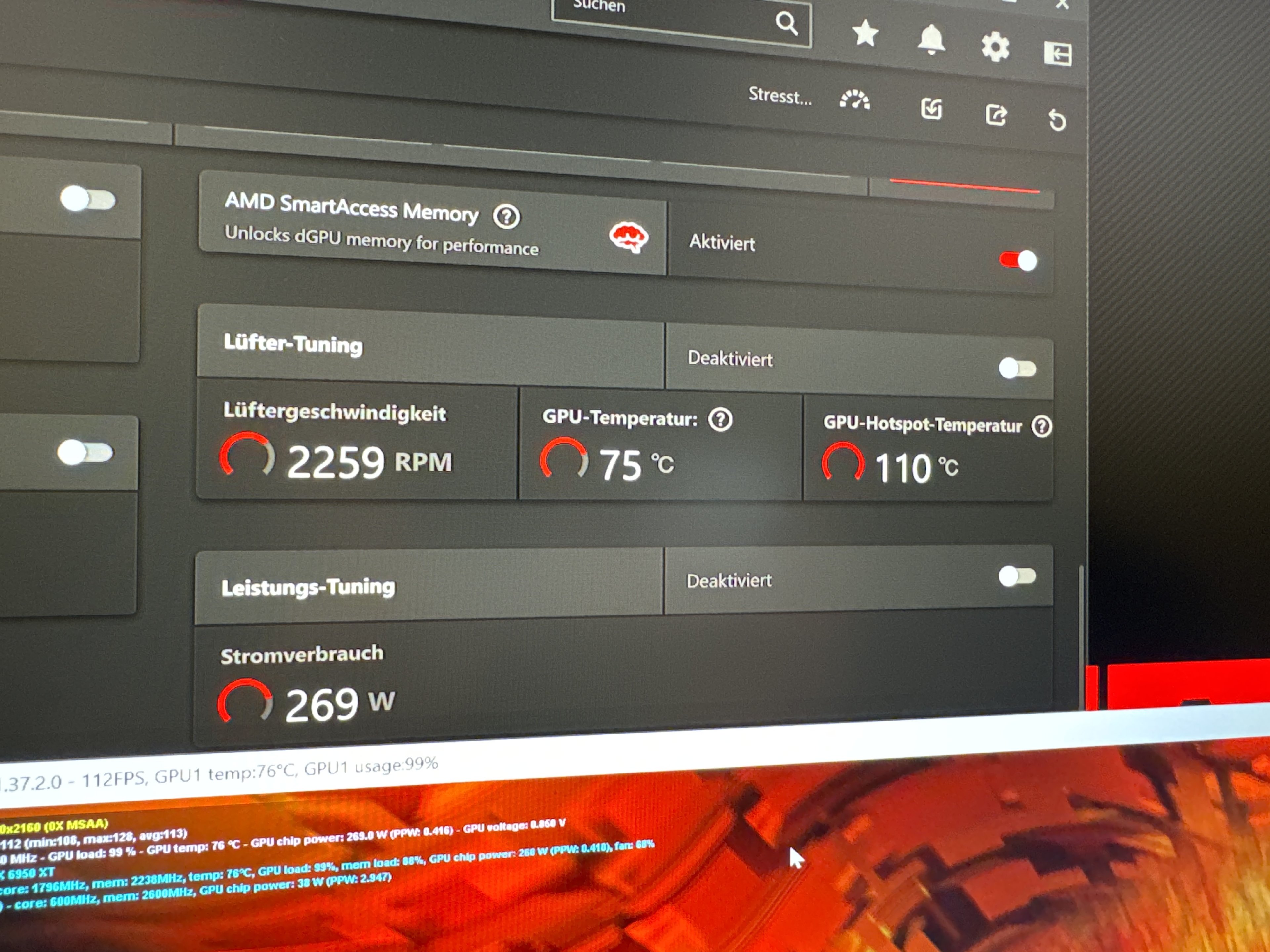 Ich würde auch erstmal mit nicht so aggressivem Undervolt anfangen, setz die Spannung mal auf 1150 mV und den Takt auf 2500 bis 2550, das Powerlimit auf +20%. VRAM sollte eigentlich gut mit 2350 laufen, die 6950 haben einfach gute Chips verbaut, aber das ist wirklich von Karte zu Karte anders.