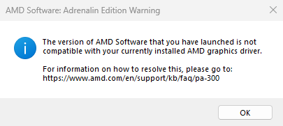 Bei dem Versuch die AMD Software Adrenalin für ein Update zu nutzen bekomme ich die Aussage:" The version of AMD Software that you have launched is not compatible with your currently installed AMD graphics driver. For information on how to resolve this, please go to: https://www.amd.com/en/support/kb/faq/pa-300"