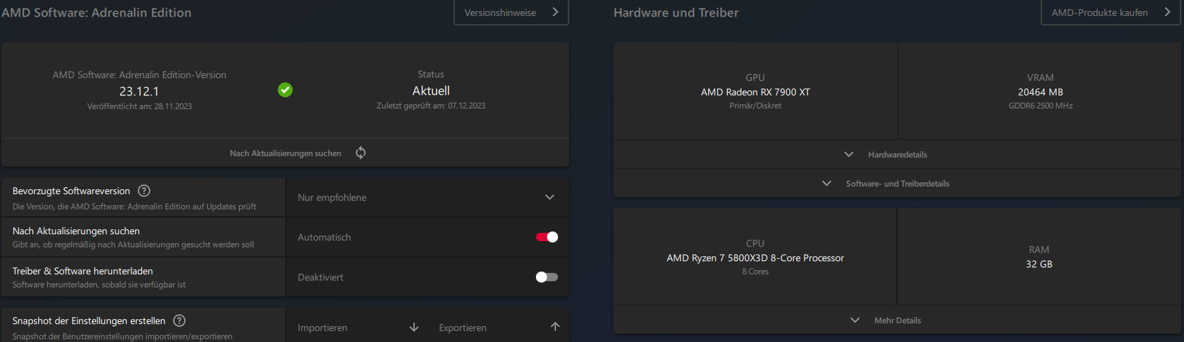 Trotz des neuen Treibers, Version 23.12.1, ist der Idle-Verbrauch meiner RX 7900XT noch immer bei fast 100W (wie eigentlich seit Release der GPU; eine Besserung des Idle-Verbrauchs hat sich nicht eingestellt).