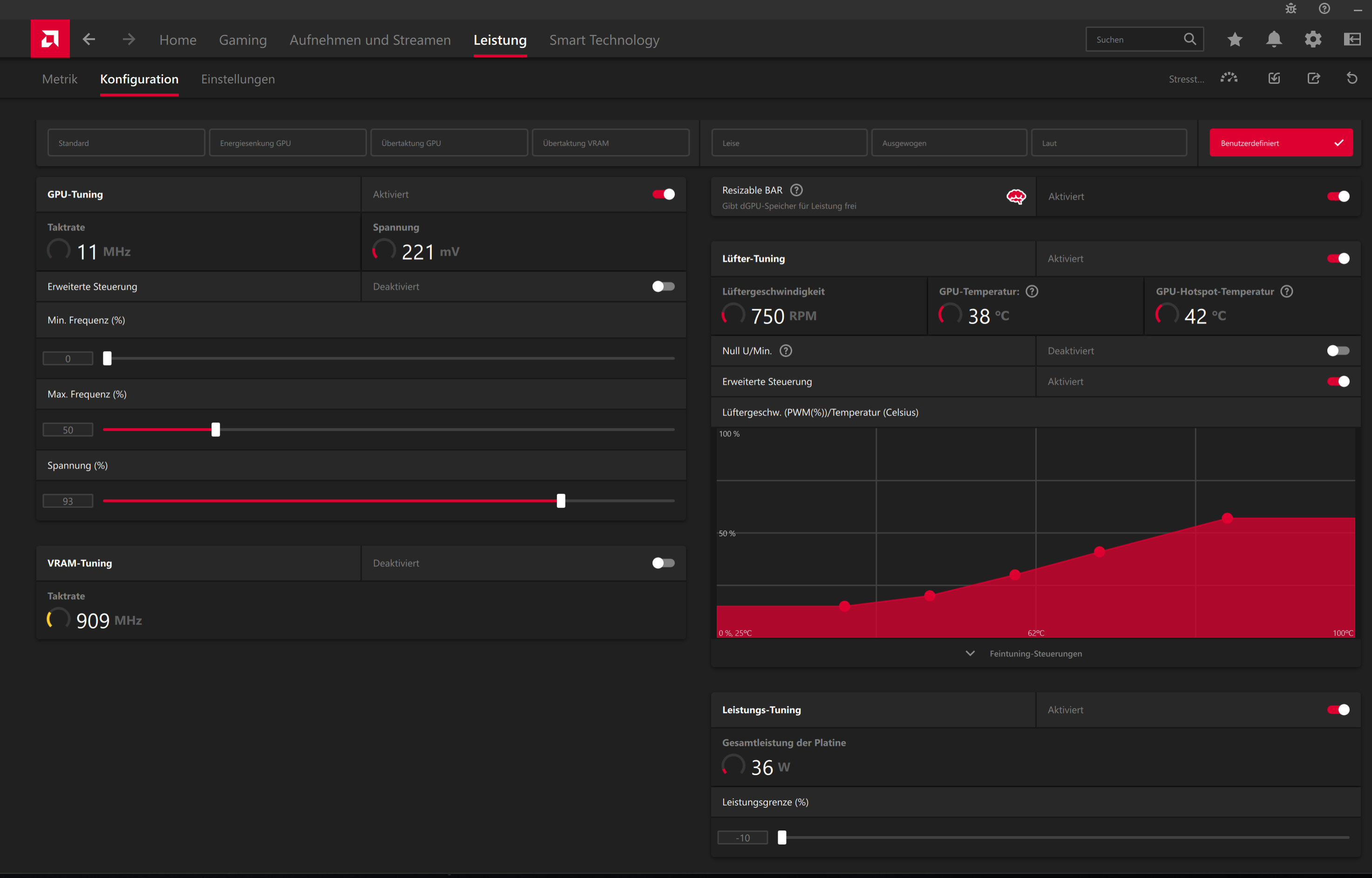 Erst zuletzt würde ich mich mit der Manipulation der Taktfrequenz der GPU beschäftigen, denn eigentlich sind die Kühlkonstruktionen von Nvidia ab der 2000 Serie und bei AMD ab der 6000 Serie immer etwas zu groß geraten und kühlen daher völlig ausreichend. Das Problem sind zumeist die konservativen BIOSe der Hersteller und Treiber. Ich z.B. habe meine 7900XT nur wieder abgegeben, weil mir der AMD Treiber wirklich auf die Eier gegangen ist. Das macht Nvidia deutlich simpler und zuverlässiger. Mit Afterburner bekommt man jede Nvidia Karte innerhalb von Minuten zuverlässig lautlos.