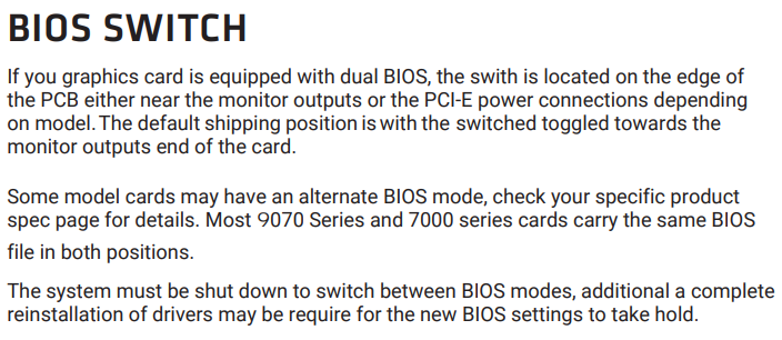 Ich würde gerne wissen, ob jemand genau weiß, was der "BIOS Switch Schalter" speziell auf der RX 9070 XT XFX Swift genau bewirkt. Die einen sagen, da passiert gar nichts, denn beide "BIOSe" sollen identisch sein und wieder andere sagen, dass das eine der Silent Modus und der andere der Performance Modus sein soll.