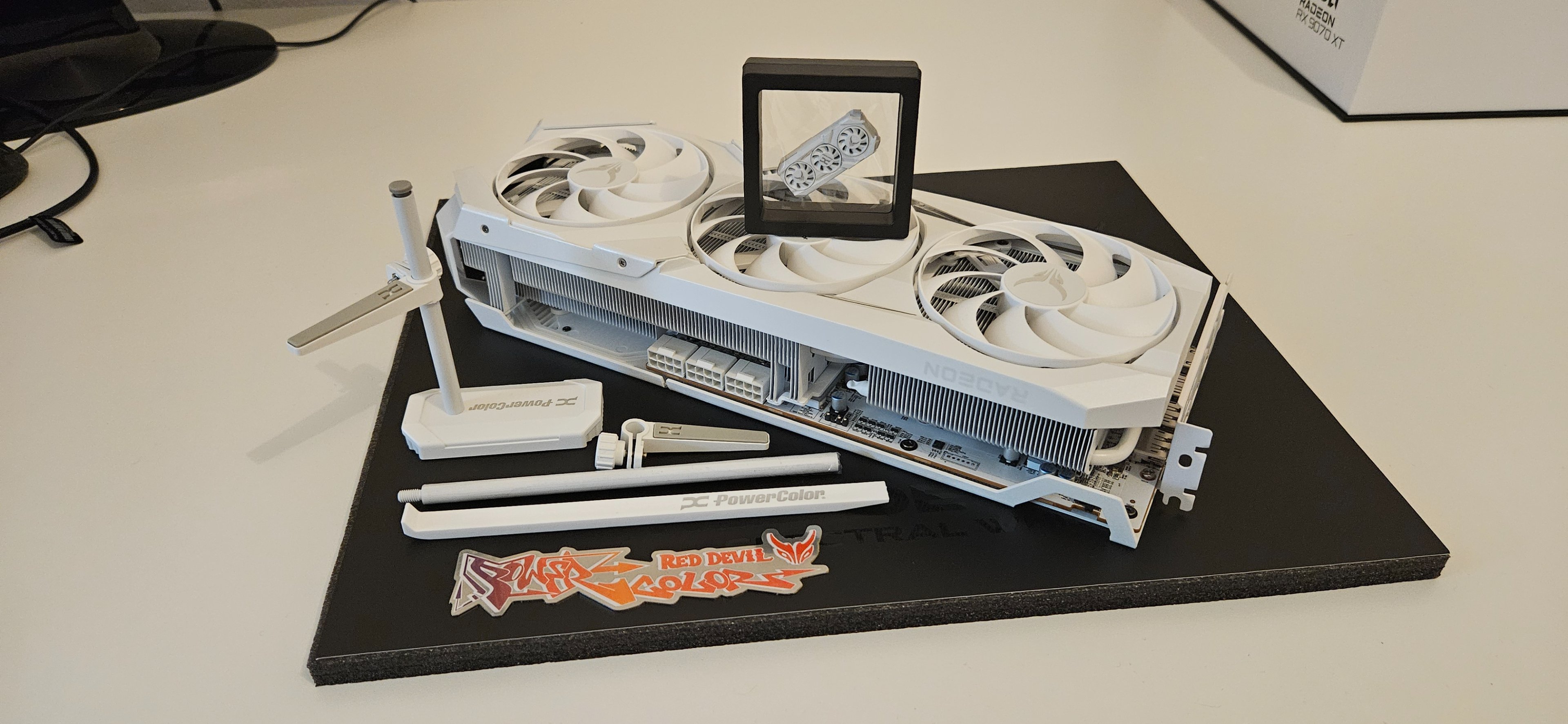 Bei der (schwarzen) Red Devil gibts zu der GPU dies dazu:Zulgohlan schrieb:gibts was an Zubehör zu den Karten, Stütze etc?