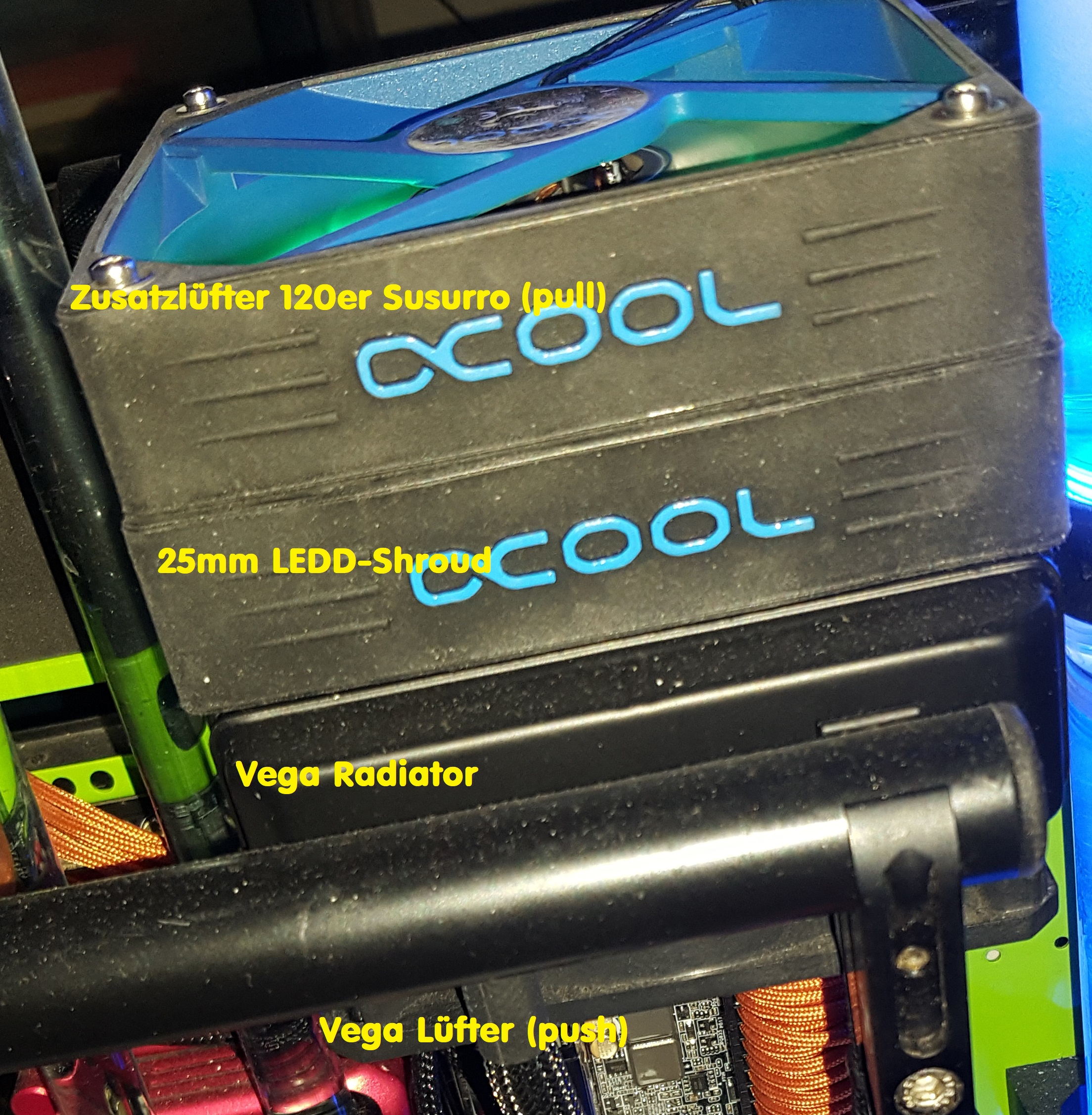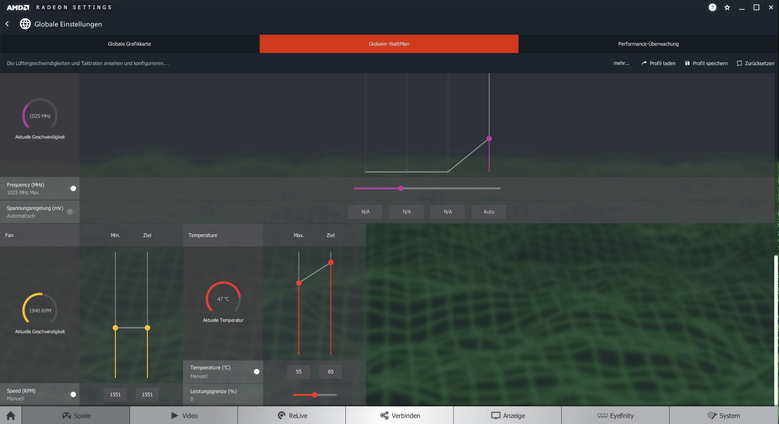 Ich habe im Moment einen 120 mm Lüfter verbaut der max. 1320 rpm schafft. Natürlich soll die Grafikkarte auch beim Spielen nicht übermäßig laut werden. Der Luftstrom ist bei 1320 rpm Lüfter nur ca. ein Drittel so hoch wie der eines 3000 rpm Lüfters.