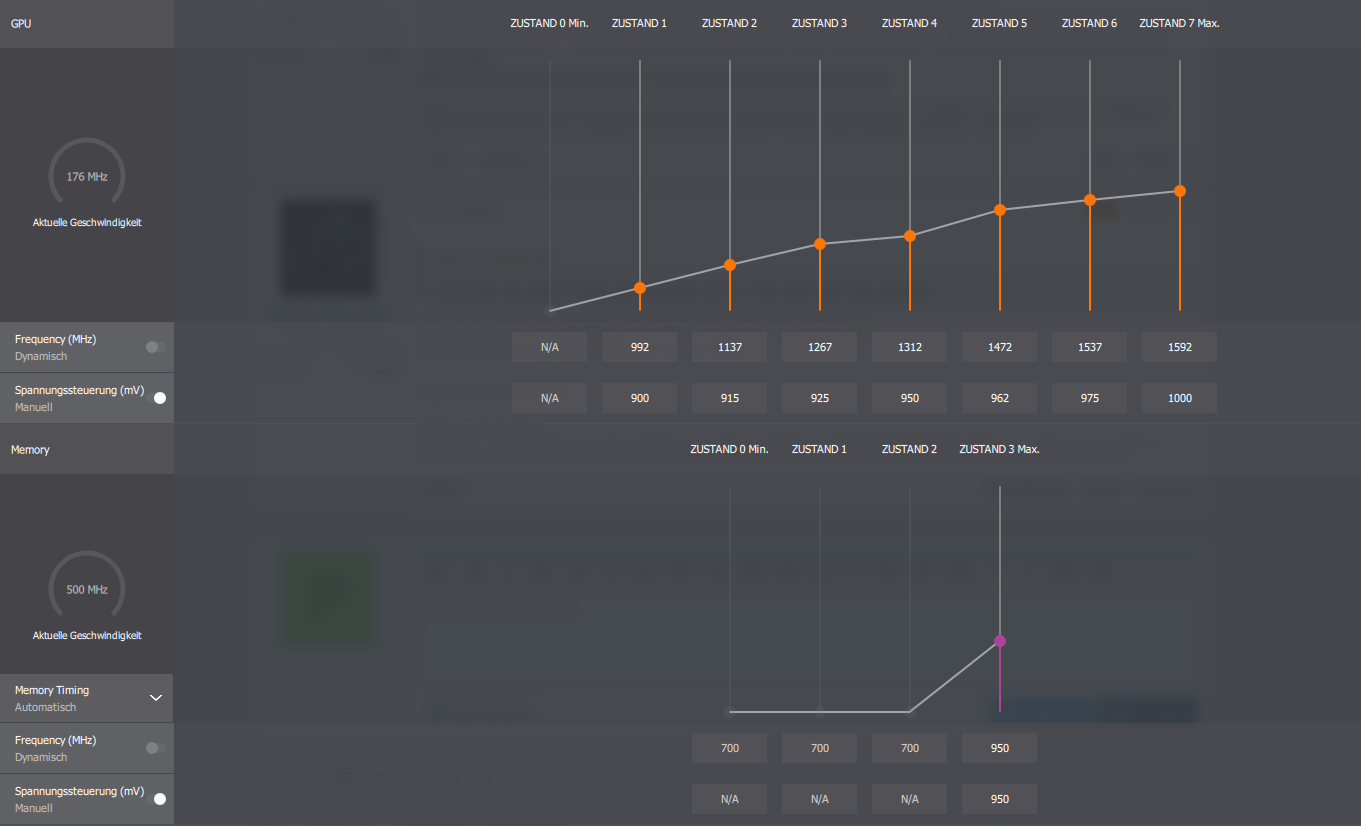 Die "Spannungsregulierung" ist eine Spannung, die immer niedriger als die GPU Spannung sein muss....zu niedrig aber auch nicht....bei mir war es das beste sie einfach auf 950mV stehen zu lassen.