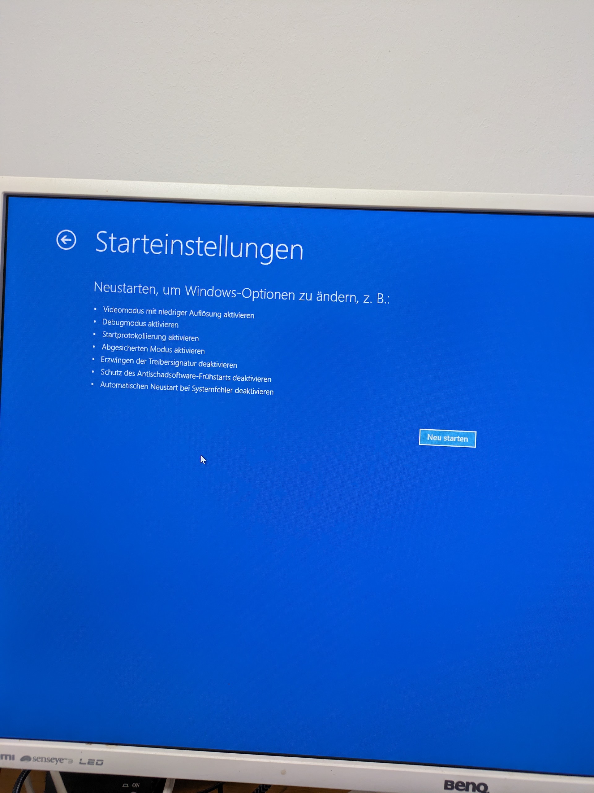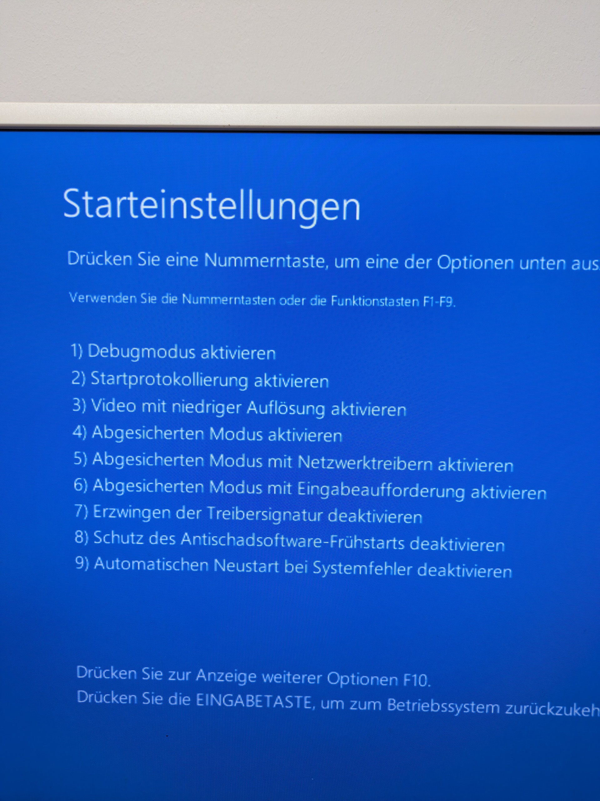Jap. Danach bekommste einen Blauen Bildschirm und wählst Problembehandlung aus. Danach auf erweiterte Einstellung. Danach drückst Du die F4 Taste, danach fährt der PC im abgesicherten Modus hoch.