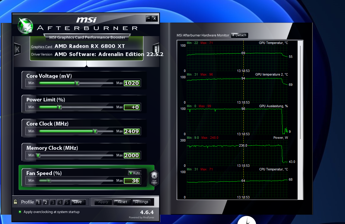 So ganz zufrieden bin ich mit dem Umstieg auf die 6800XT nicht.Sie verhält sich einfach komisch.Mal ist sie nur zu 30% ausgelastet und mal zu 90%.