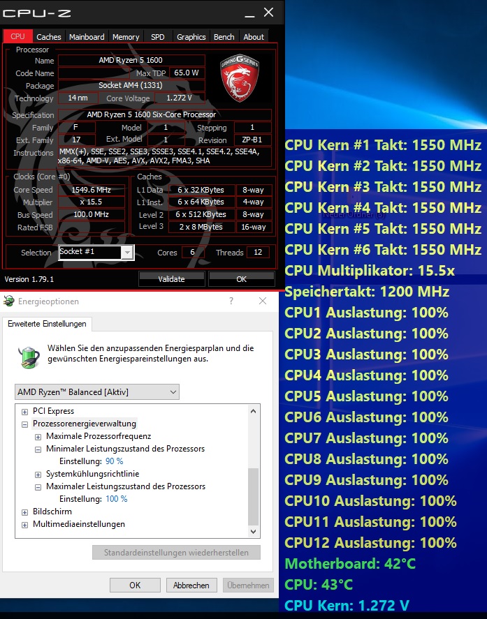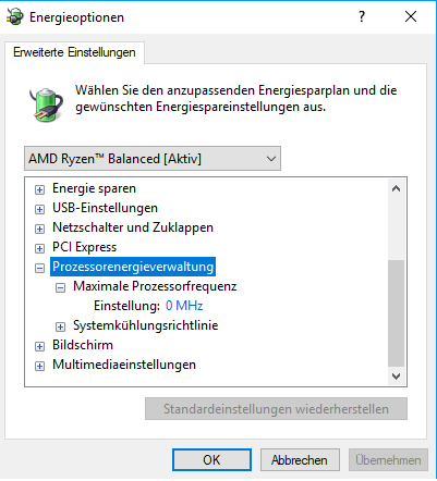 Nach jedem Neustart taktet die CPU lediglich mit 1500MHZ! Das lese ich aus mit CPU-Z und Ryzen Master. Die 1,320V behält es aber bei. In den Windows-Energieoptionen habe ich "Ryzen Balanced" gewählt. Hier kann ich aber plötzlich in der "Prozessorenergieverwaltung" den minimalen und maximalen Leistungszustand nicht mehr verändern. Diese Einträge sind einfach weg (siehe Bild).