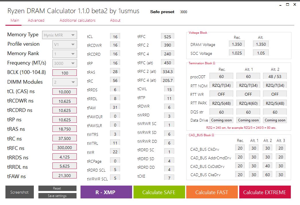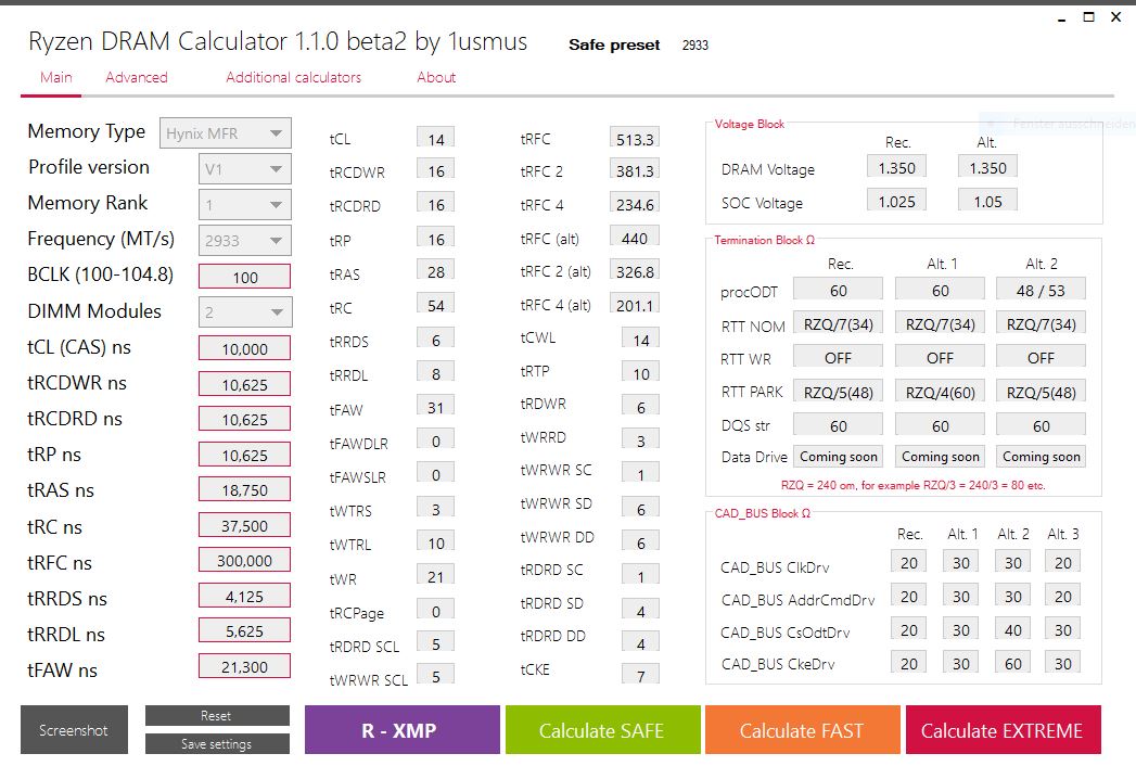 Bei dem Calculator ist eigentlich nicht wirklich viel einzustellen, einfach bei Memory Type "Hynix MFR" angeben, 3000 Mhz Frequenz, Rank 1 ist default, das ist richtig bei Dir, 100 Mhz BCLK und dann "R-XMP" drücken. Danach "Calculate Safe" vermutlich, denn Du willst ja, dass überhaupt was passiert. Dann wäre es wichtig zu wissen, was Du in "DRAM Controll" im BIOS einstellen kannst, das Handbuch gibt keine Infos darüber raus. Wenn Du alles mögliche eingeben kannst, dann fotografier Dir das was der Ryzen DRAM Calculator ausgegeben hat und hack das von Hand ein.