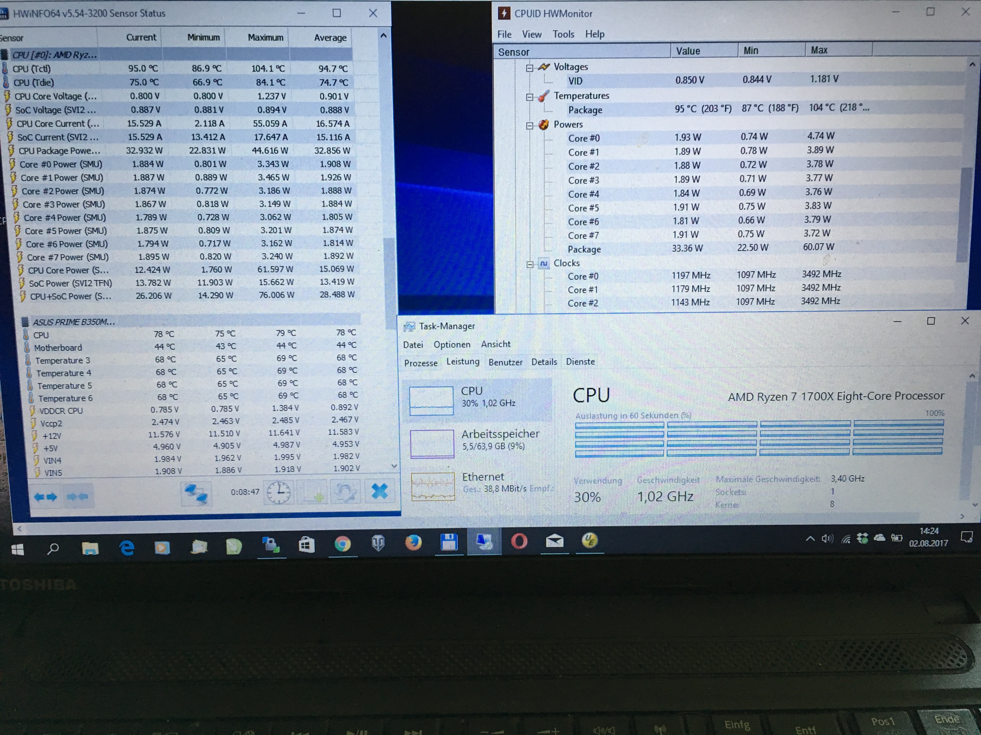 Also fix mal Hwinfo und HWMonitor installiert und nach den Temps geschaut. Hwmonitor zeigt mit eine Package-Temp von 95 Grad (max. 104) und Hwinfo zeigt CPU Tctl bei 95 Grad sowie CPU Tdie bei 75 Grad. Und das bei, laut Taskmanager gerade mal 30% Auslastung.