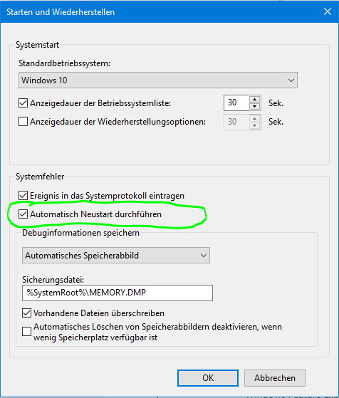 Diese Einstellung (Bild) hat nur einen Einfluss drauf, ob das System nach dem anzeigen des Bluescreens