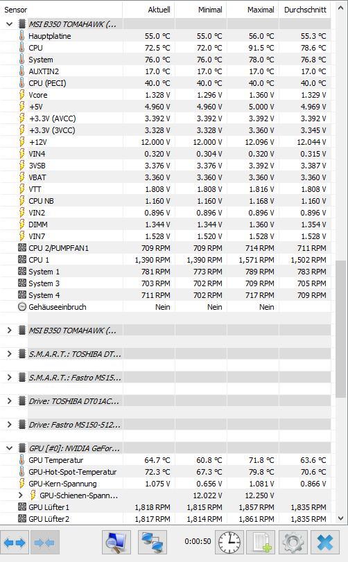 Wärmeleitpaste wurde auch schon ausgetauscht (Arctic MX-4), Airflow ist in dem Case zwar abosulut Arsch aber die GPU läuft recht Kühl. Abnehmen der Front verbessert zwar Airflow, aber kaum die CPU Temps (2-3° Kühler). CPU Fan Curve geht ab 70°C bis 80°C auf 100%, im BIOS eingestellt.