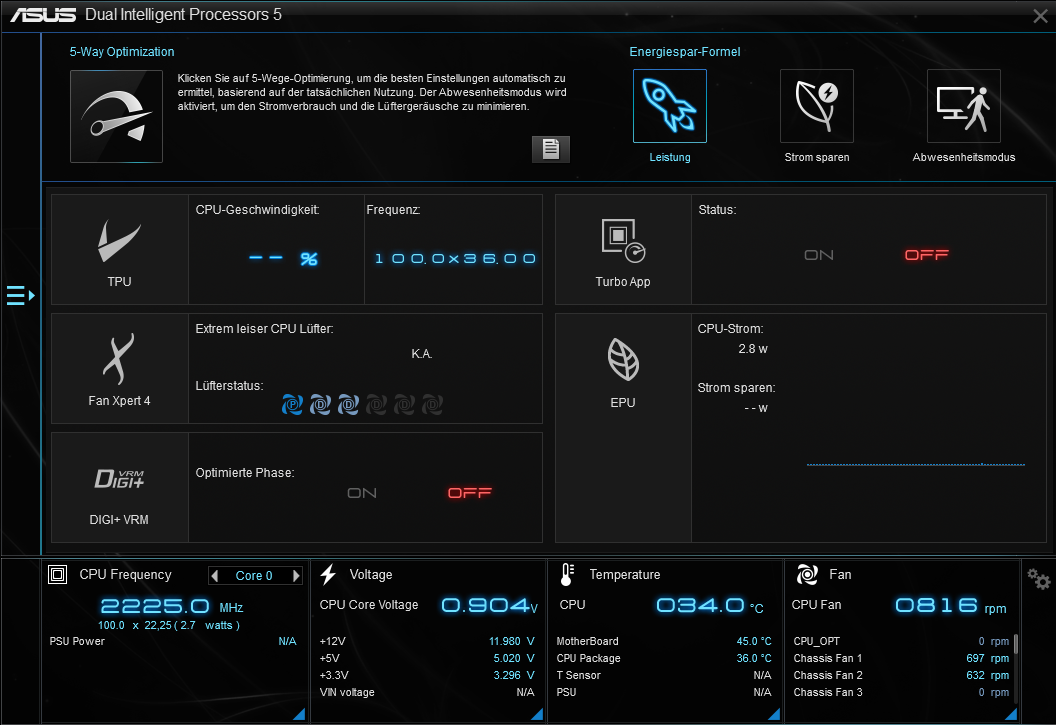 Im Idle taktet die CPU wieder auf 2.2Ghz runter, Vcore entsprechend ebenfalls.