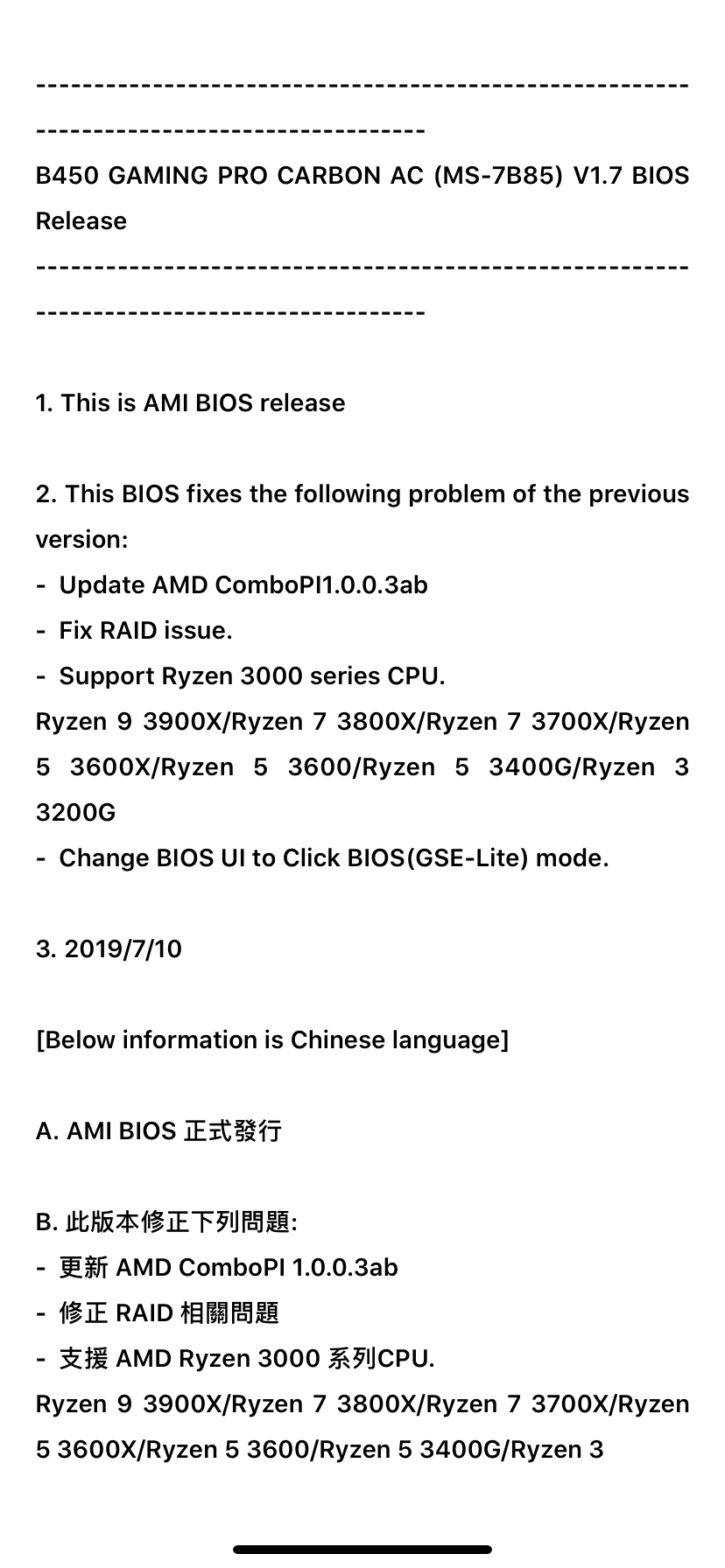 FwSteiner666 schrieb:Wenn man aber am 24.06. ein BIOS veröffentlicht und als Change notes die Kompatibilität verspricht, sollte es auch funktionieren. Sonst hätte ich mir tatsächlich ein anderes Board gekauft. Das sind ja falsche Tatsachen