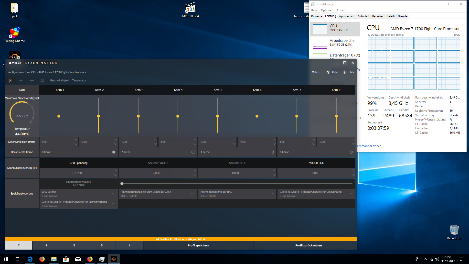 Ich bin relativ neu, was Overclocking angeht und habe mir vor kurzem ein neues System zusammengestellt. Mein Problem besteht darin, dass mein Ryzen bei einer Erhöhung von gerade einmal 100Mhz abschmiert. Laufen tut er gerade mit 3,4GHz @ 1,235V. Ich weiß, dass das ja okay ist aber ich würde trotzdem gerne etwas mehr rausholen und nachdem was ich in den Foren gelesen habe, sollten 3,7GHz ja eigentlich überhaupt kein Problem darstellen. Ich teste mit Aida64 und mein System crasht bei 3,5GHz @ 1,235V nach circa 2 Minuten. Wenn ich die Spannung etwas höher nehme (1,3V) verändert sich auch nichts an dem Zustand. Ich weiß, dass man auch einen OC Krüppel erwischen kann aber, dass er, so wie es aussieht einfach überhaupt nicht übertaktbar ist kann doch eigentlich garnicht sein, oder? Übertaktet habe ich übrigens mit etlichen Anleitungen im Bios und, als das nicht funktioniert hat, mit dem Ryzen Master Tool, beides erfolglos. Ich bin wiegesagt relativ neu was das alles angeht und könnte mir vorstellen einen Entscheidenden Faktor einfach zu übersehen. Mit den wie oben angegebenen 3,4GHz läuft er allerdings problemlos im Stresstest mit 69°C unter Volllast. Den RAM habe ich zu testzwecken auf 2133MHz @ 1,2V gestellt. Es ist Vielleicht noch zu erwähnen, dass es sich um ein ITX System handelt.