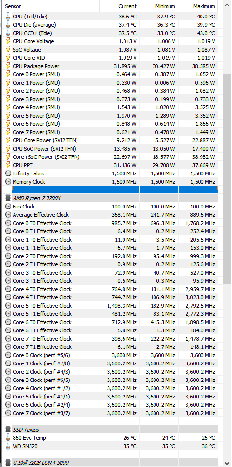 Hab dir mal ein Bild von meinem 3700X (ohne aktiven Turbo) angehängt, da lief HWinfo ne Zeit lang mit während ich hier mit Edge im Browser surfe, Twitch offen hab etc.