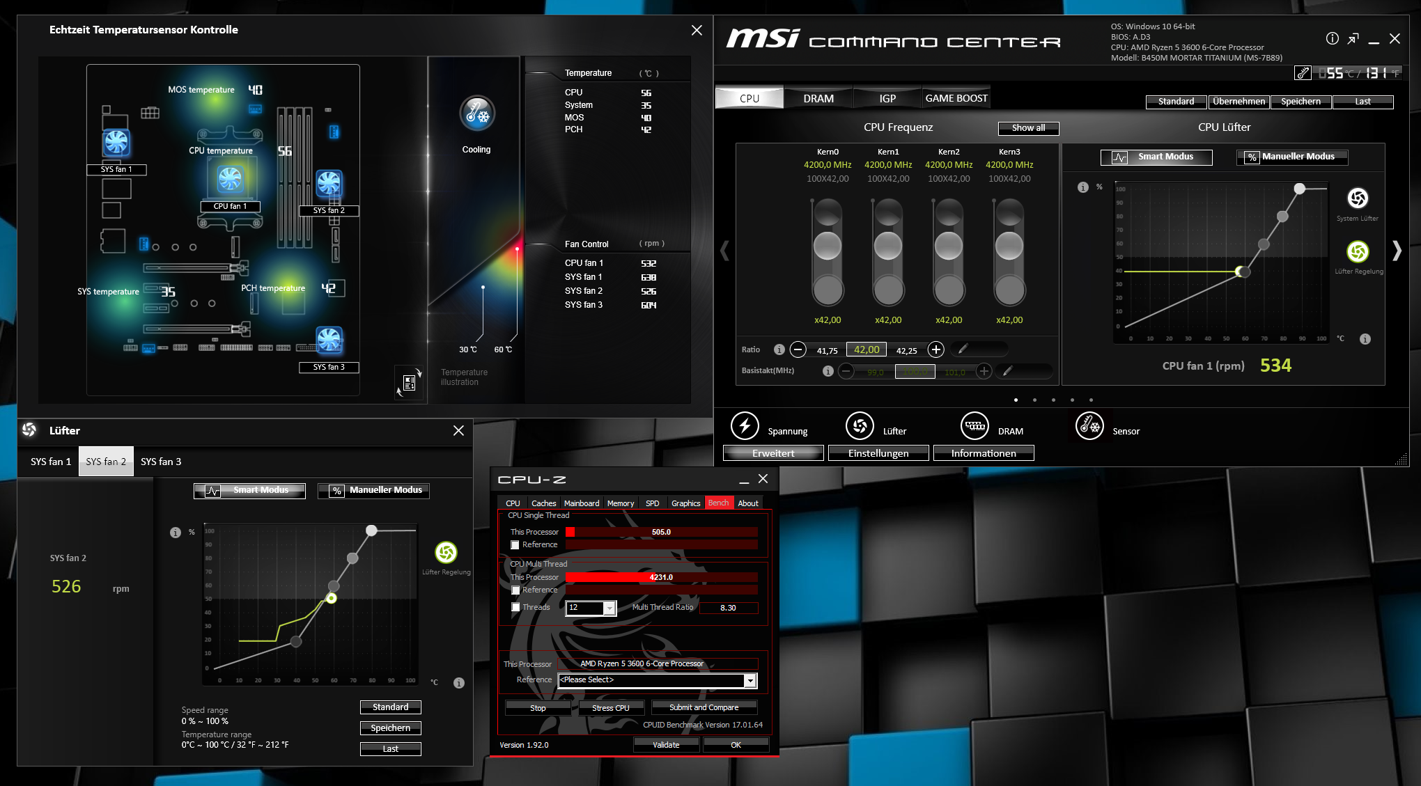 Habe nach neuem BIOS Update auf AGESA 1.0.0.6 auf MSI Mortar Titanium / B450 Board nochmal sämtliche Einstellungen vornehmen müssen und ein wenig mit den Lüfterkurven gespielt über das MSI Command Center um im Desktop Betrieb möglichst leise zu sein, bei Last aber natürlich die Temps nicht unnötig hoch zu haben.