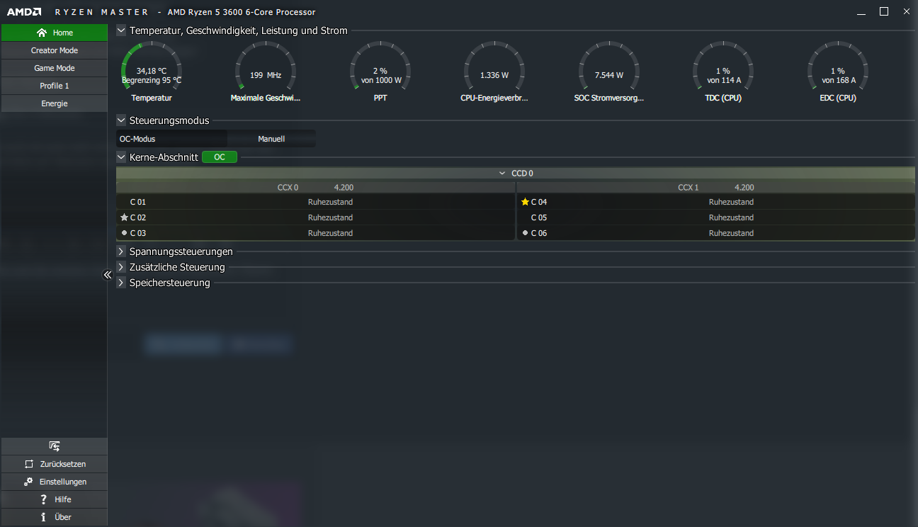 Ich bekomme das nicht mehr hin, ohne Veränderungen außer Lüfterkurven durchgeführt zu haben, ist sie jetzt immer bei ~72°C und entsprechend taktet der Proz runter auf 4100 MHz oder weniger. Entsprechend fällt auch das Ergebnis des BM geringer aus. Zur Kontrolle noch den AMD Ryzen Master überprüft, aber der zeigt tatsächlich das gleiche an wie der MSI Command Center ;-)