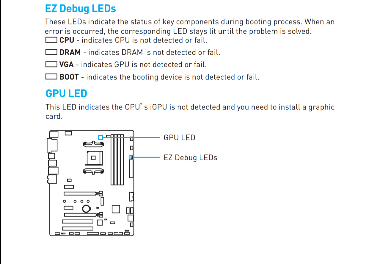 Des Weiteren leuchten zwei LEDs am Mainboard die jeweils auf einen Fehler an der Gpu hinweisen.