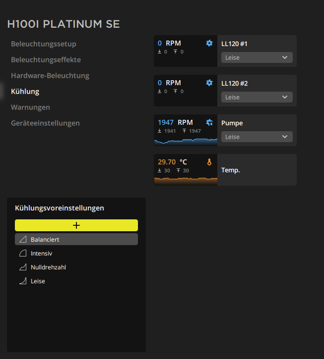 Ich steuere meine Lüfter über den Corsair Commander Pro, daher steht oben im Bild bei der Drehzahl der Lüfter zur AiO eine Drehzahl von 0.