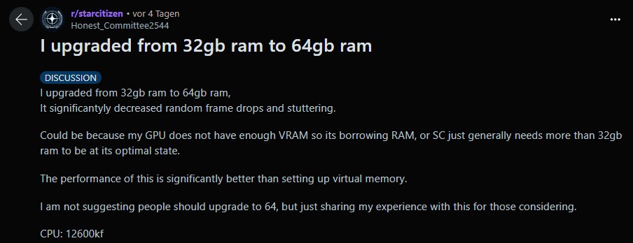 Daher habe ich auch den Arbeitsspeicher für mein 5800X3D System nicht von 32GB auf 64GB aufgerüstet, obwohl Star Citizen 64Gb benötigt damit die Pagefile nicht die ganze zeit benötigt wird.