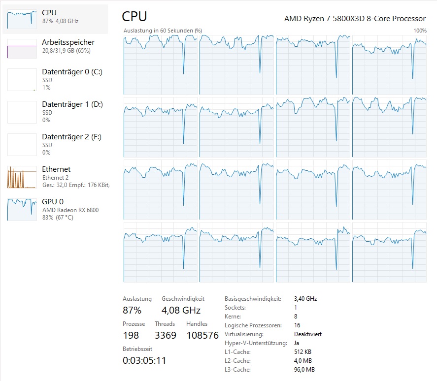 Schau dir mal meine CPU Auslastung in Star Citizen bei meinem 5800X3D an.
