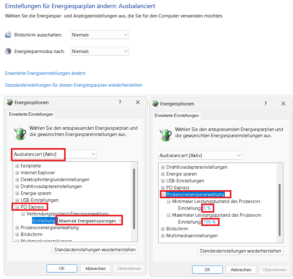 Den auf "Ausbalanciert" stellen und diese Einstellungen kontrollieren.