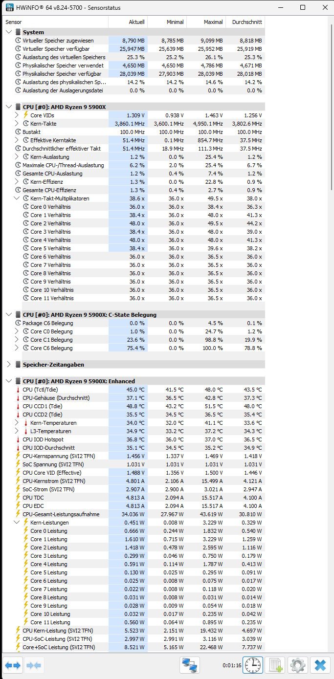 Ich habe mal ein paar Screenshots von HwInfo Sensors in verschiedenen States gemacht: