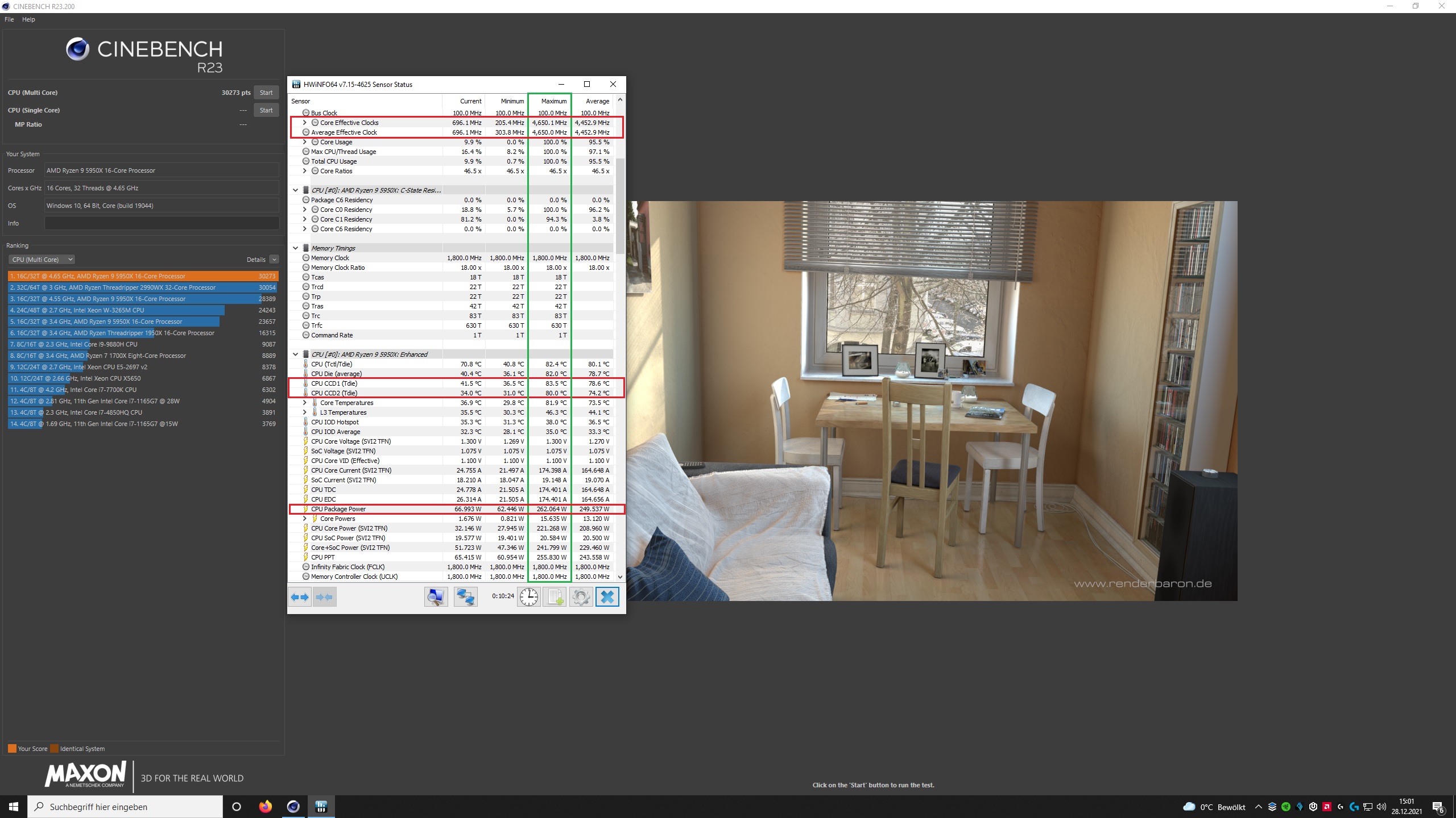 Hier ein Screenshot mit Cinebench R23 bei Allcore OC 4,65 Ghz 30273 Punkte und eine Temperaturdifferenz von CCD1 zu CDD2 von 3,5 Grad