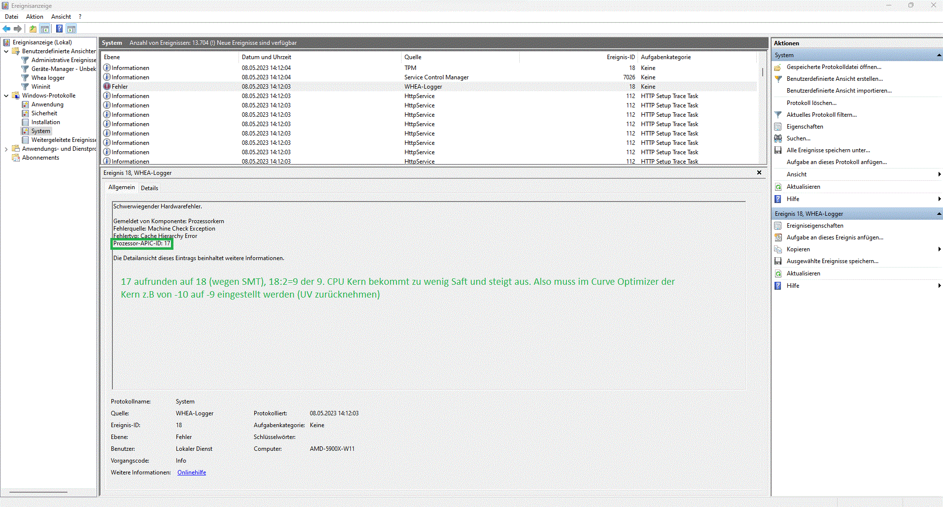 peterX schrieb:Dann schau mal in die Ereignianzeige unter Anwendungs- und Dienstprotokolle/Microsoft/Windows/Kernel WHEA.
