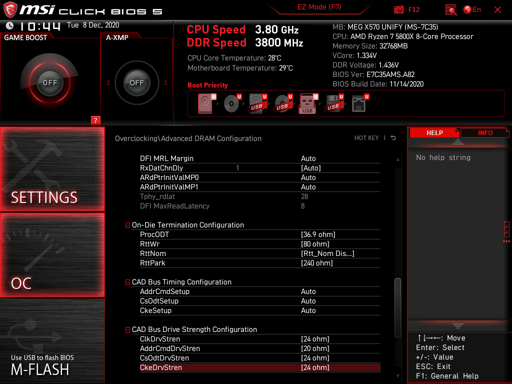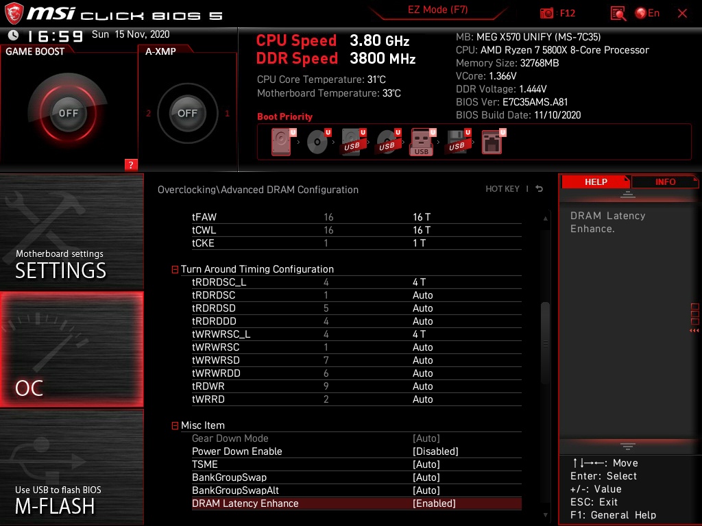 - Sämtliche Versuche den RAM per Hand entsprechend den Angaben aus dem DRAM Calculator zu übertakten scheitern. Das System bootet bei 3600 safe, fast und 3800 safe nicht einmal. Ich kann alle nötigen Einstellungen vornehmen außer "Gear Down Mode". Die Option ist ausgegraut und steht auf auto.