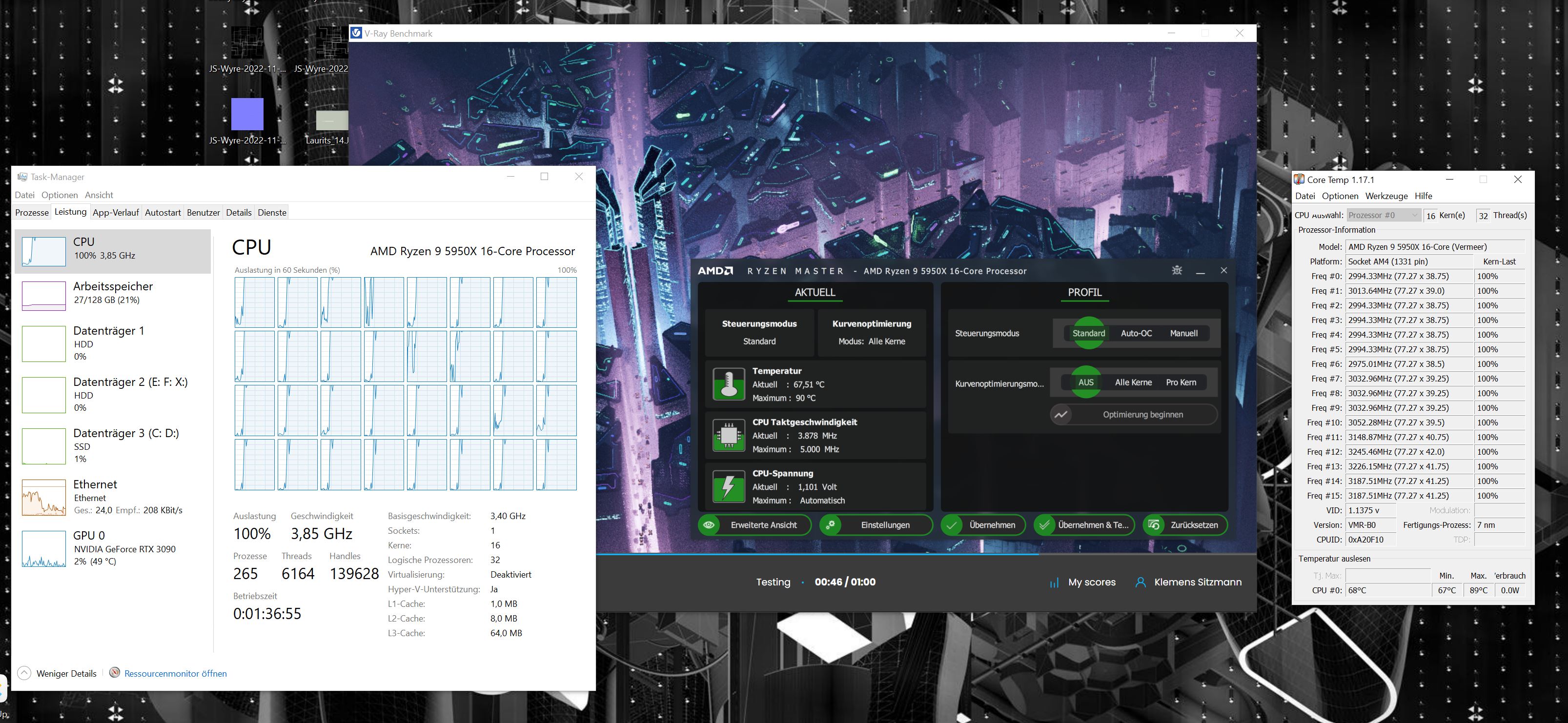Folgendes Problem trat auf. Von vorne Weg hat der Ryzen 5950X nicht so toll funktioniert. Bei Benchmark hat er sich auf 400MHz (10%) heruntergetaktet und war megalahm. Ich habe danach den Prozessor undervoltet und danach ging er richtig gut. Ich verwende den Rechner v.a. zum Rendern und 3D Sachen zu machen. Bei 100% Auslastung aller Kerne & Threads wird die CPU 66-67 °C warm.
