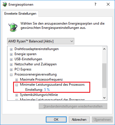 Also, habe alles ausprobiert, was ihr gesagt habt. Das Energiemanagementprofil ist auf "ausbalanciert". Das "Ryzen Ausbalanciert" Profil, welches man runterladen kann, funktioniert nicht mehr. Habe die aller neueste Version von Windows. Unter den Energieoptionen sind auch die "5%" eingestellt. Lese den Wert über CPU-Z aus. Habe Ryzen Master (Übertaktungssoftware) wieder deinstalliert. Hatte sie aber auch nicht benutzt und hat was meinen Fall betrifft, auch nichts gebracht. CPU_Z_Ryzen.JPG