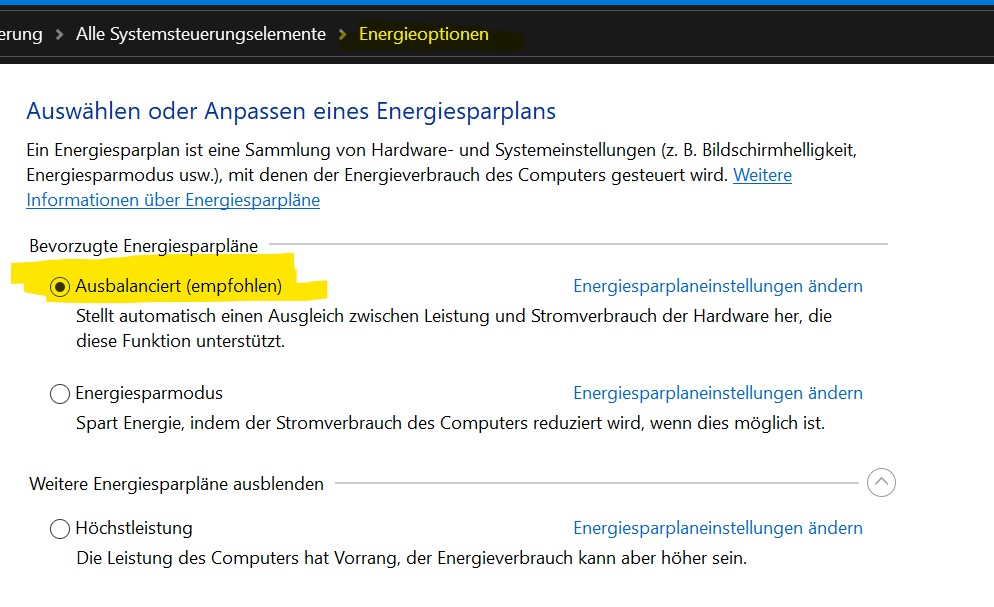 Suche unter Windows nach "Energiesparplan" und dann "Ausbalanciert" auswählen und prüfen