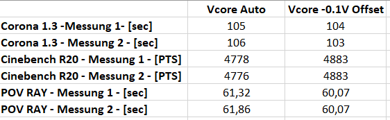 Habe dann noch verschiedene offset Settings getestet, das maximum war -0,087v ohne Leistungsverlust, geht man auf 0,1v verliert man direkt 200Punkte, spart aber kaum Strom und Temperatur ein. Der Singlecore wert sinkt gerade mal um 6 Punkte auf 500.