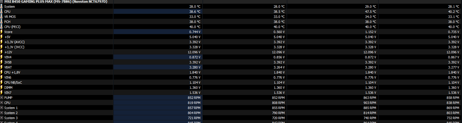 Und hier noch Mainboard Spannungen und Lüfterdrehzahl alles flüster Leise. Tausch die AIO um und kauf dir einen guten Luftkühler fertig. P.s. Habe einen Lüfter an den Pumpen Header vom Mainboard angeschlossen also nicht wundern.