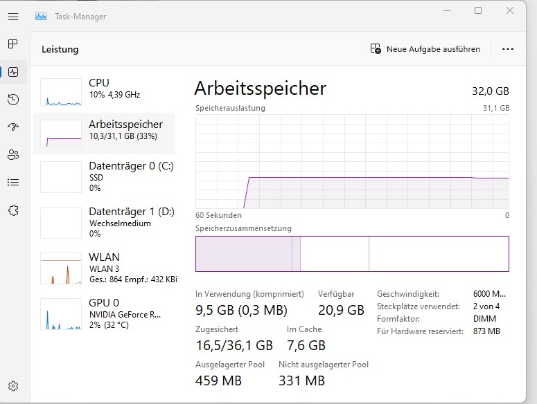 Und bitte das Fenster vom Taskmanger auf Screenshots ganz aufziehen so das man sehen kann was unten rechts bei Für Hardware Reserviert etc steht