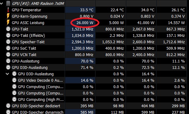 Hmm ich kann nur fĂŒr den 8700G was sagen, wĂ€hrend der ein 4k Video in Youtube abspielt zeigt HWInfo ~ 16W (ASIC)Icetrey schrieb:Hi Leute, habe gestern einen 8500G bekommen, mir ist aufgefallen dass der Stromverbrauch der GPU bei der Wiedergabe eines Youtubvideos sehr hoch ist. Laut HWINFO zieht die GPU 30 Watt. Zum Vergleich habe ich noch einen Minisforum PC mit 5800H und der alten Vega-Grafik, die benötigt im Durchschnitt grade mal 10 Watt. Habt ihr Ă€hnliche Werte ?