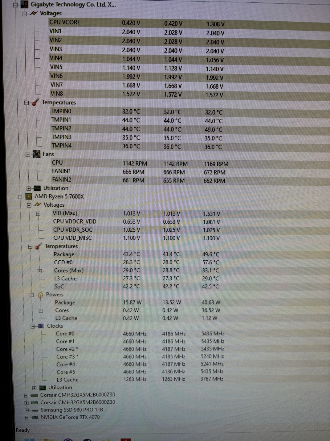 Beim Idle hat die CPU Pckage 42,1 Grad, 27,9 CCD #0, Core Max: 27,5 rad, L3 Chace 29,6 Grad und Soc 21.8 Grad.