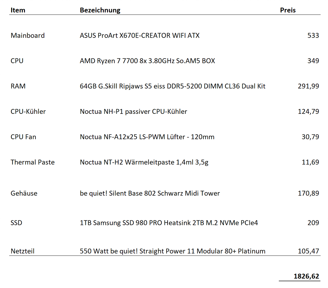 Die Zusammenstellung der Komponenten für den PC hänge ich für die bessere Einschätzbarkeit mit an.