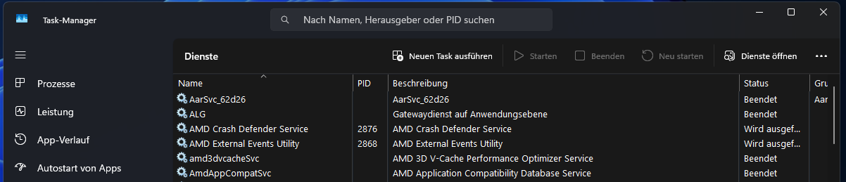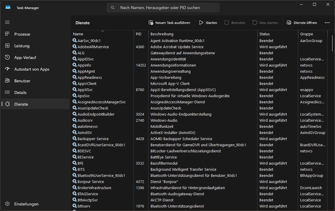 Task-Manager (Strg + Umschalt + Esc) → Reiter "Dienste".
