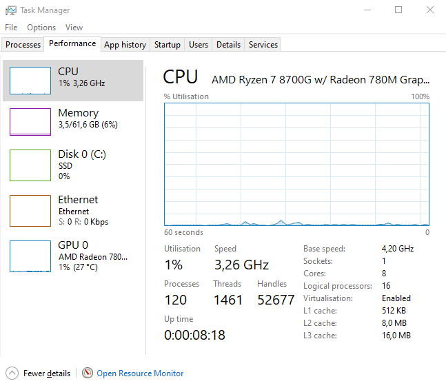 Relevant ist die Zeile „momentane Richtlinie: Frequenz sollte innerhalb 2.40 GHz und 4.60 GHz“. Man könnte meinen, da schießt eine Einstellung in Linux quer, dass da nicht 400 MHz steht, jedoch finde ich unter /etc keine relevante Erwähnung von “2400“ oder „2.4“. Aber in Windows sieht es ähnlich aus. Ich muss zugeben, dass ich von Windows und dessen Energieplänen dieser Tage kaum noch Ahnung habe (zu XP-Zeiten hatte ich Drittsoftware zur Taktkontrolle auf dem Laptop genutzt). Ich habe meinem Spiele-Windows-10 mit Bordmitteln versucht beizubringen „du darfst zwischen X und Y dynamisch takten, wenn die Last gebraucht wird“. Aber der Task Manager zeigt dauerhaft 2400 MHz an (bzw. jetzt im Screenshot sogar noch mehr), auch im Leerlauf. Ich habe hwinfo64 befragt, das sagt mir schon wieder andere, aber ebenfalls sehr hohe Werte.